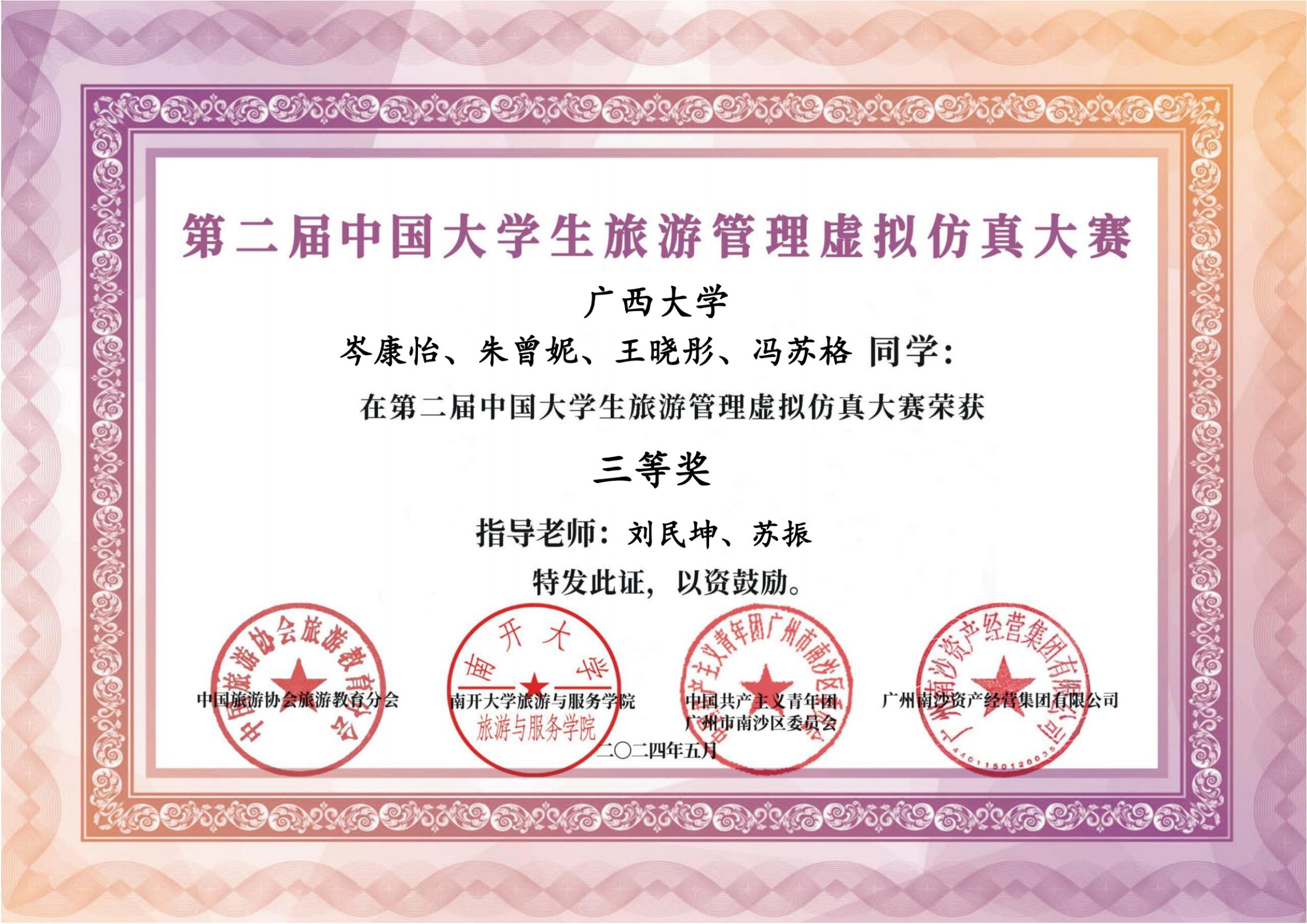 近日,由中国旅游协会旅游教育分会、南开大学旅游与服务公司等单位主办的第二届中国老员工旅游管理虚拟仿真大赛落下帷幕,公司旅游管理专业2023级本科生(岑康怡,朱曾妮,冯苏格,王晓彤)组成的参赛队伍表现出色,荣获大赛三等奖。