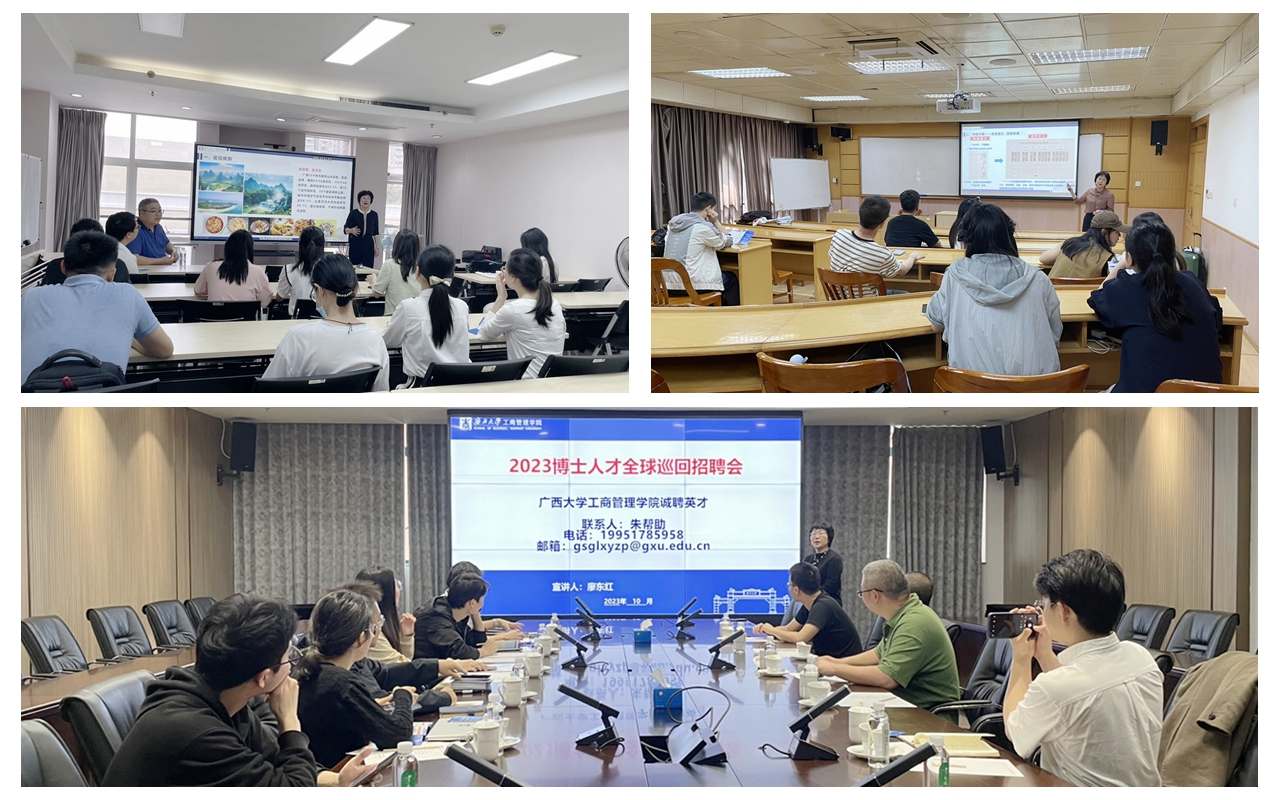 廖东红副经理分别在暨南大学管理公司(左上)、厦门大学管理公司(右上)、中山大学管理公司(中)开展人才招聘宣讲
