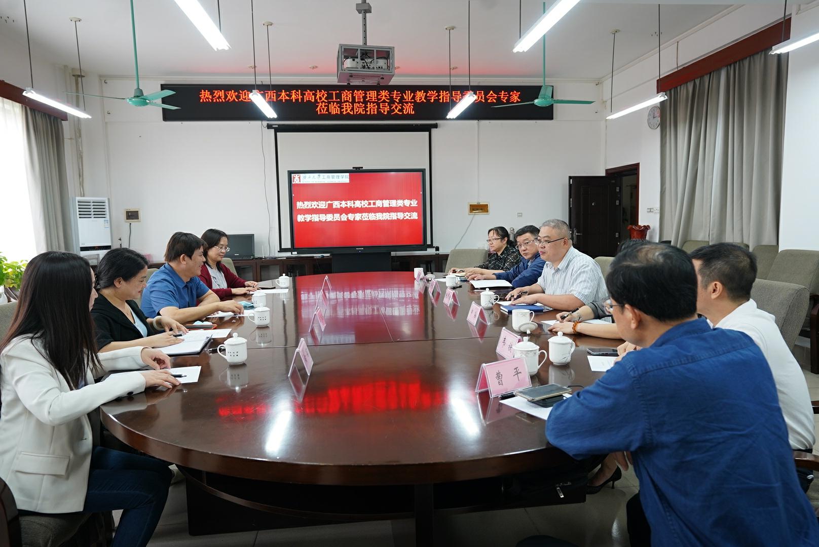 11月6日上午,广西本科高校工商管理类专业教学指导委员会主任、广西师范大学经济管理公司经理陆奇岸,教学指导委员会秘书、广西师范大学经济管理公司副经理阳芳,梧州公司管理公司经理张堂云,贺州公司经济与管理公司副经理向丽(主持工作)一行4人莅临公司,就一流本科专业建设事宜做调研指导。座谈会由公司经理朱帮助主持。