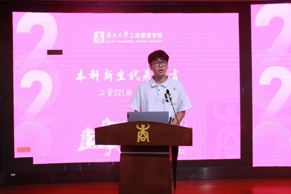 工商管理类221班郑淦耀同学、工商管理22级博士田超同学作为新生代表发言。他们向师长们表示真诚的感谢,向同学们表达相遇的美好,并对未来的学习与生活表示展望和期待。郑淦耀同学作为本科新生代表,表现出新一代青年人奋勇向前的精神,翱翔万里长空的志向。田超同学作为博士生新生代表,希望大家可以在学术上培养创新精神、坚定目标、不畏困难,并祝福2022级新生有所收获,踏上学术新征程。