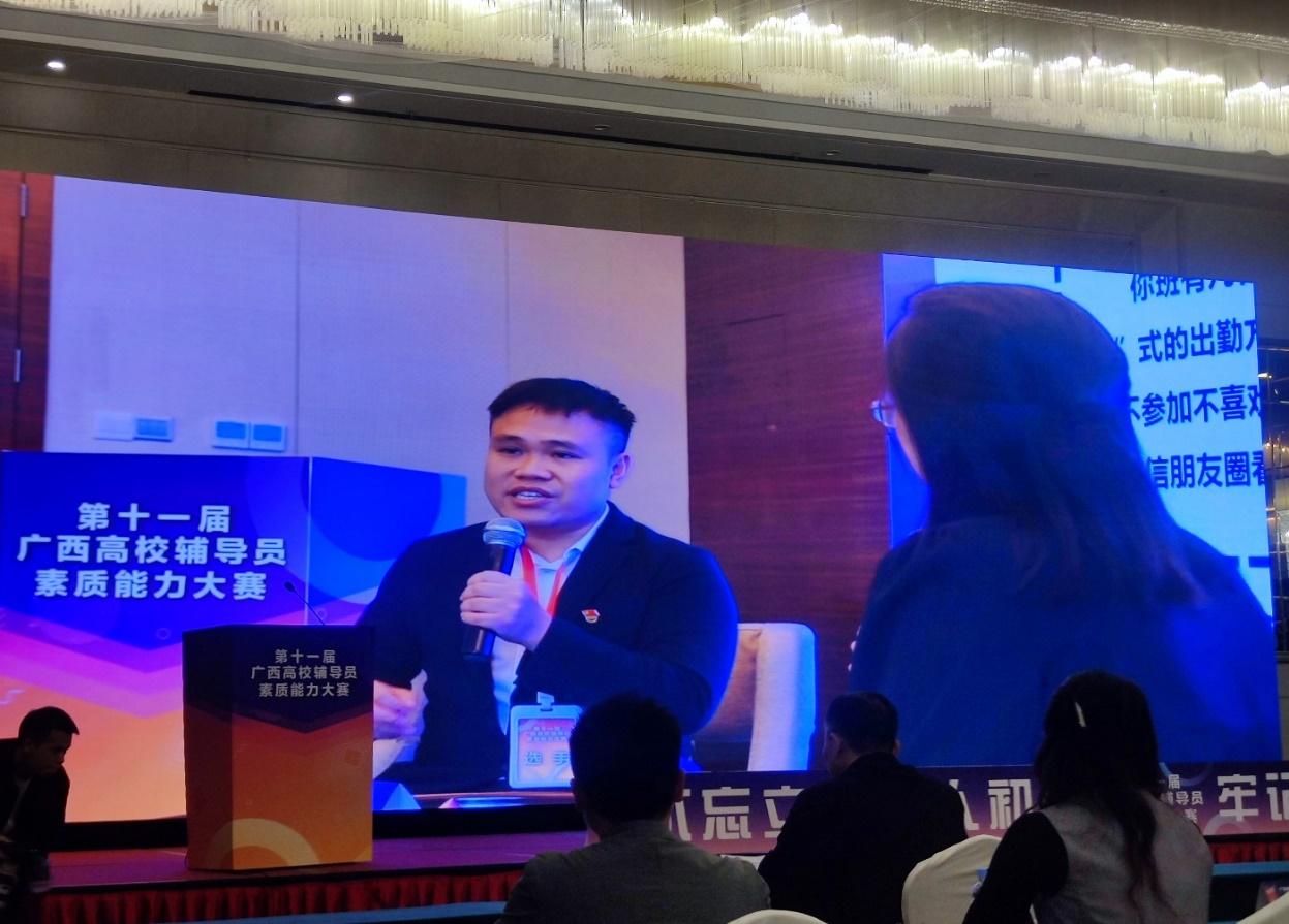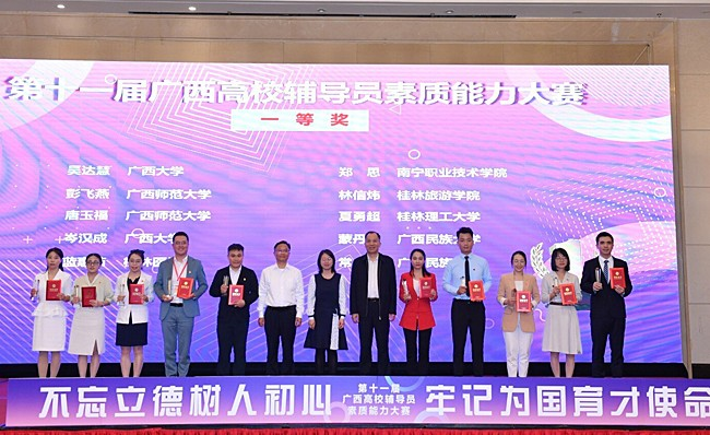 5月12至14日,由自治区教育厅主办,教育部高校思想政治工作队伍培训研修中心(广西师范大学)承办的第十一届广西高校辅导员素质能力大赛在桂林举办,共有来自全区各高校的84名专职辅导员参赛。经过三天激烈角逐,公司辅导员岑汉成老师以总分第四名获得大赛一等奖,并在“基础知识”、“谈心谈话”两个比赛环节中获“最佳表现奖”。
