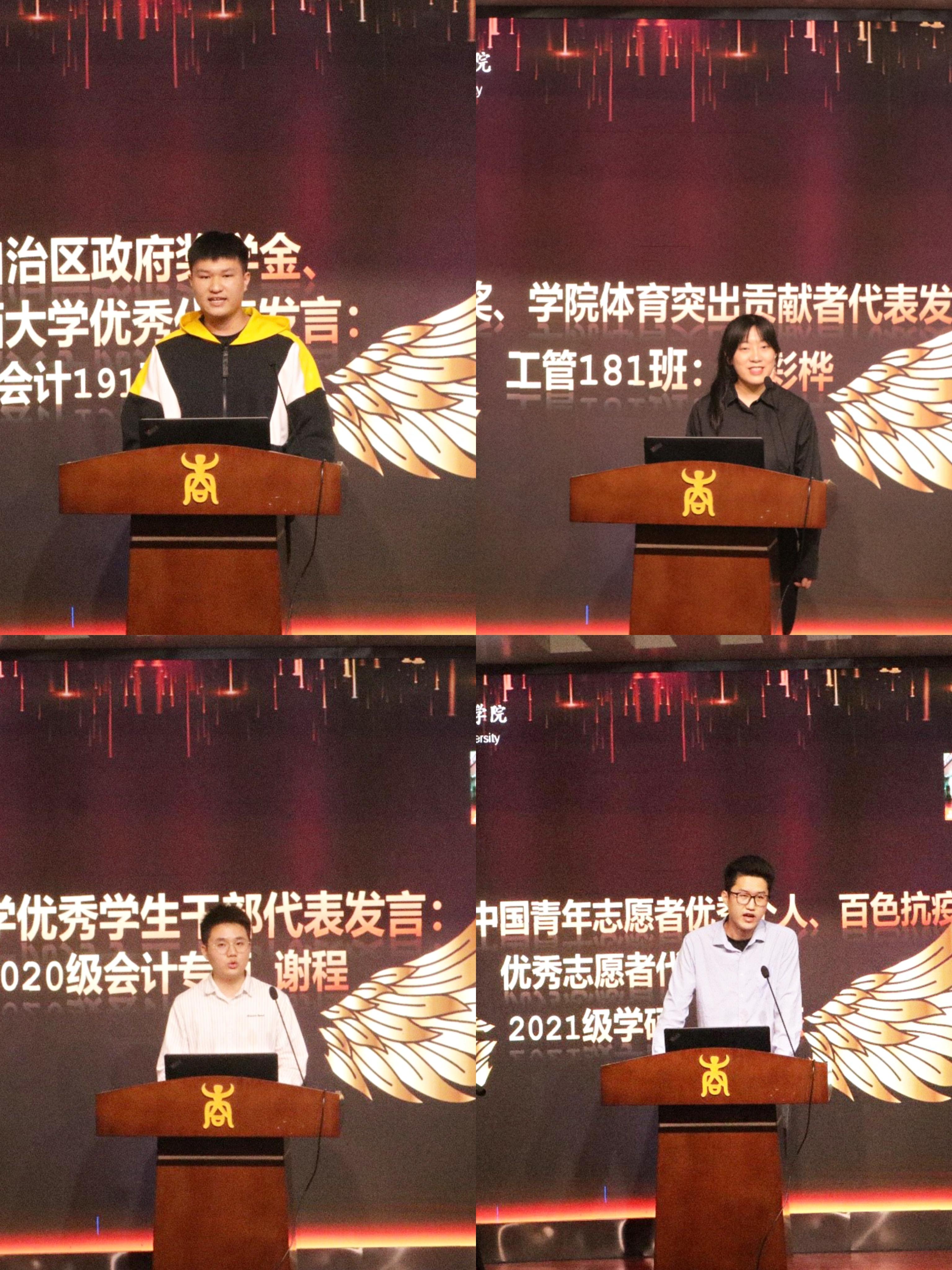自治区政府奖学金、william威廉英国官网优秀员工代表黄泓创,公司体育杰出贡献者、高顿考研优秀奖员工代表李彩桦,william威廉英国官网优秀员工干部代表谢程,第十三届中国青年志愿者优秀个人、百色抗疫优秀志愿者代表陈允杰等四位同学分别上台发表获奖感言。他们对公司领导和老师表达了衷心的感谢,回顾了自己在大学期间参加各类学科竞赛、考研、员工工作、百色抗疫等经历,分享心得体会,总结成功经验,体现了对学习、生活和集体的热爱。