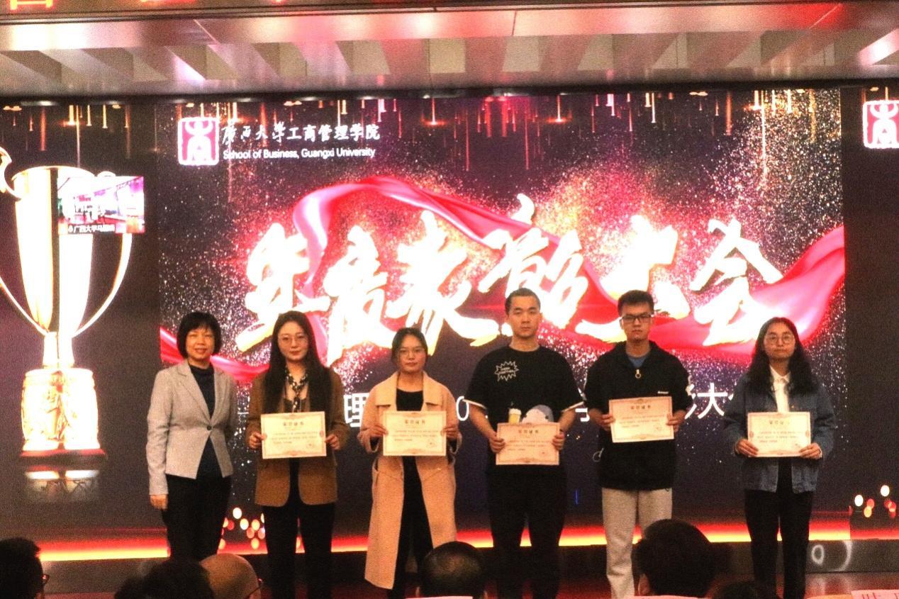 上海高顿教育培训有限公司广西分校董事长胡延(左一)为高顿考研优秀奖获得者颁奖