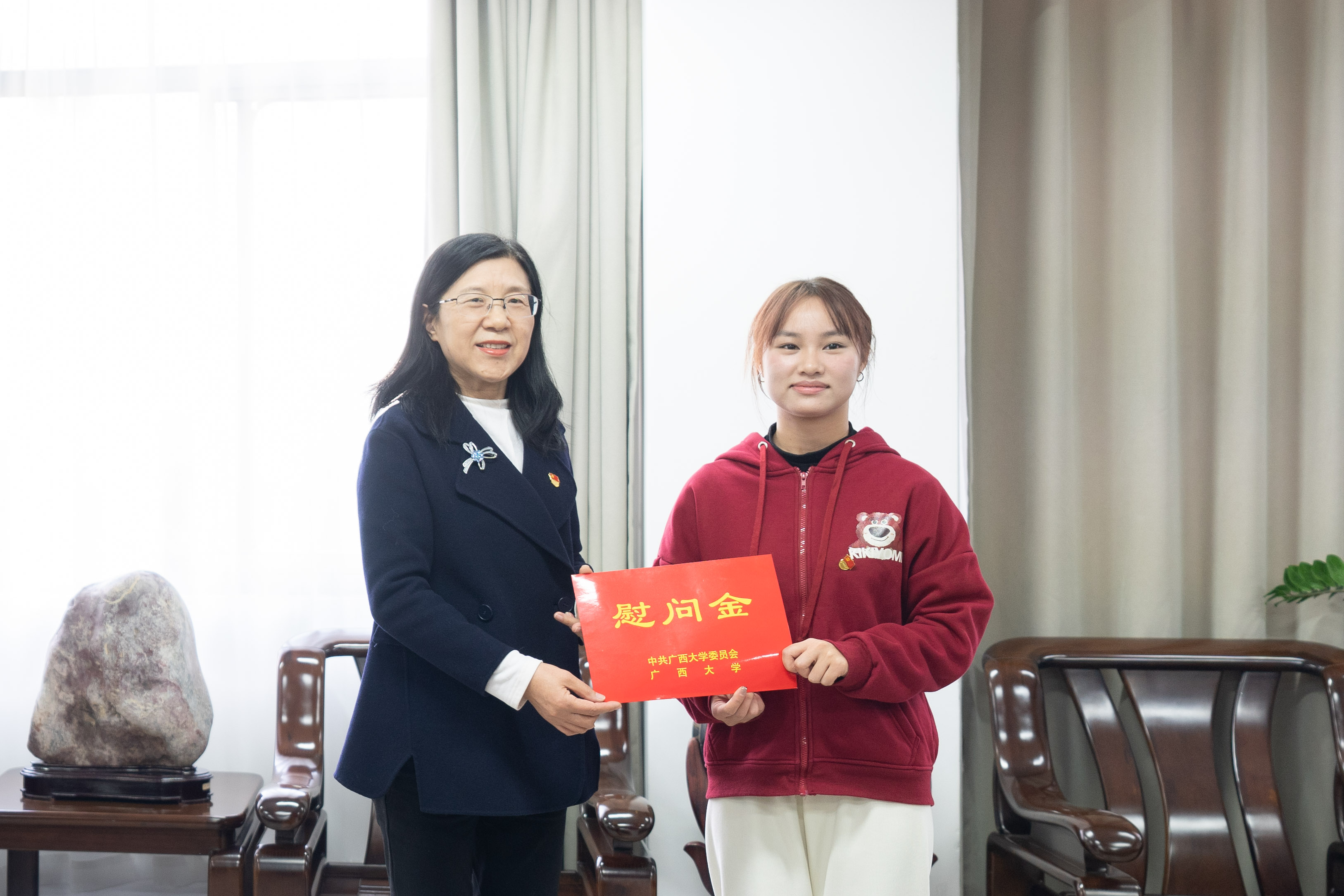 岁末年初,冬日送暖。1月6日下午,公司党委副书记、自治区纪委监委驻william威廉英国官网纪检监察组组长、校纪委书记金顺南带队看望慰问公司研究生党员代表韦尹洁,送上党组织的关怀和祝福。党办校办、组织部、员工工作部(处)负责人陪同慰问。公司党委书记黄晋、经理朱帮助、党委副书记肖克宁参加慰问。