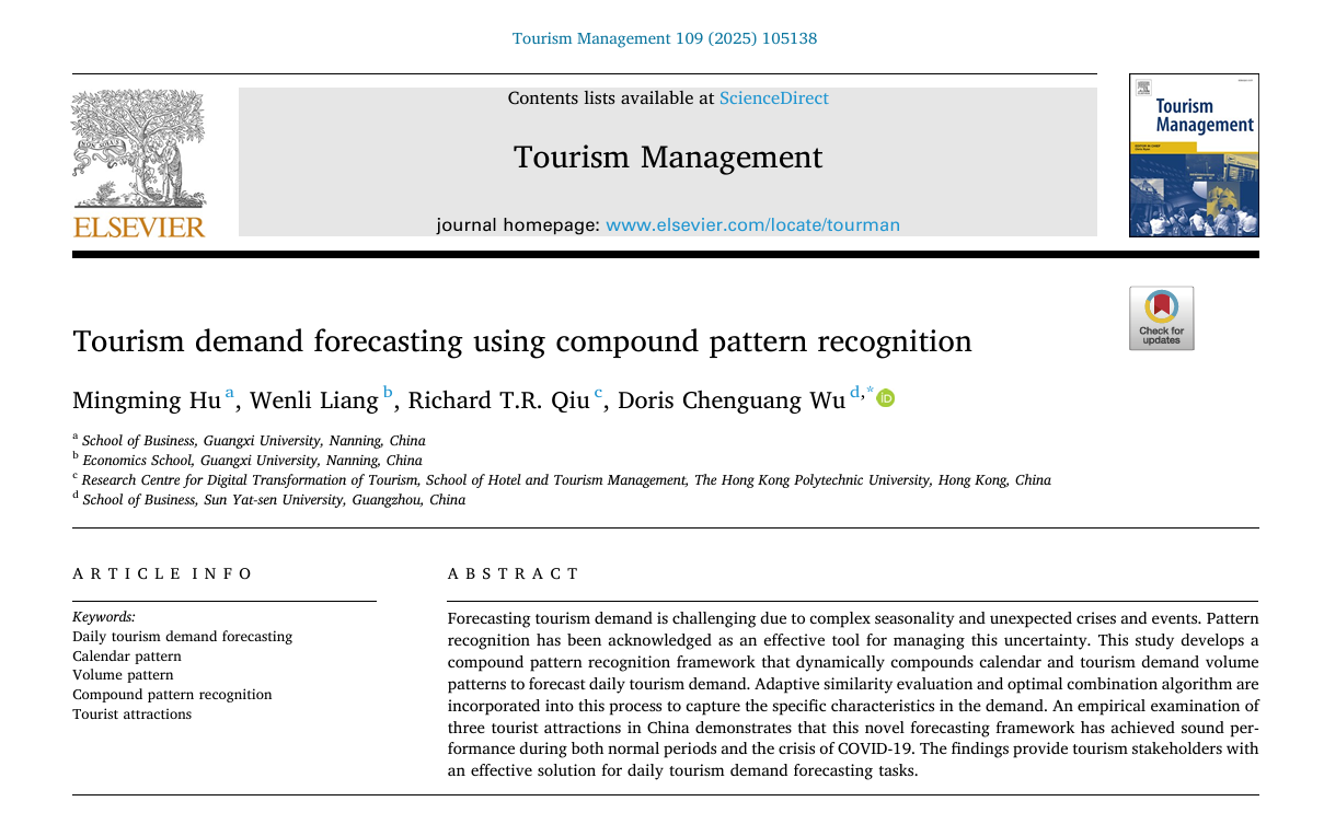 近日,公司胡明明团队在基于复合模式识别的旅游需求预测领域取得新进展,研究成果以“Tourism demand forecasting using compound pattern recognition”为题,在旅游管理国际三大顶刊之一的《Tourism Management》上发表。论文的第一作者为william威廉英国官网副教授胡明明,经济公司硕士研究生梁文莉在胡明明副教授指导下参与研究并共同发表论文,william威廉英国官网为论文的第一单位。