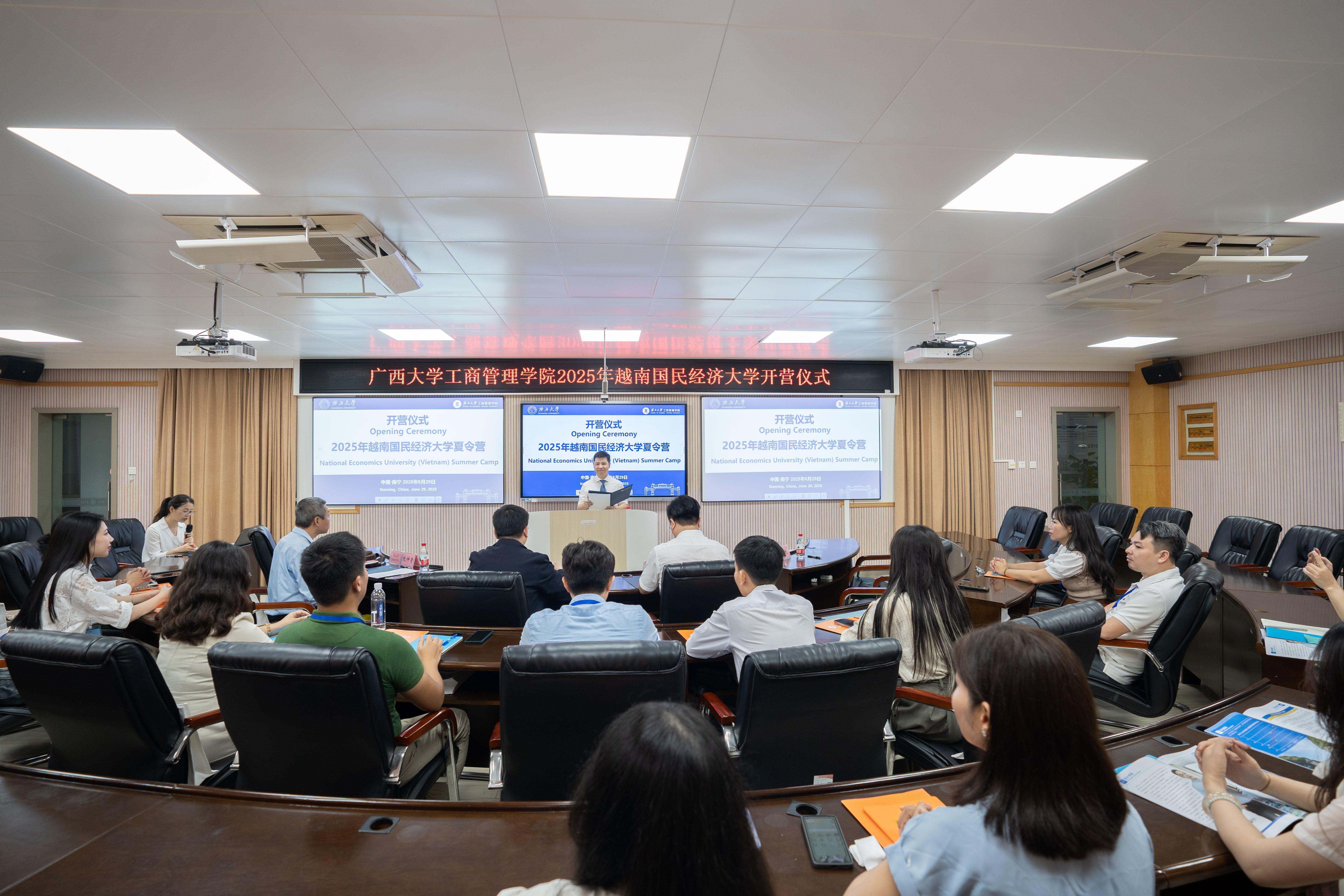 2025年是中越建交75周年暨“中越文化交流年”,为促进中越青年交流合作,公司与越南国民经济大学联合举办“2025年越南国民经济大学夏令营”活动。6月29日上午,夏令营开营仪式在公司511教室举行。公司国际交流与合作处处长廖文丹,公司党委书记黄晋,越南国民经济大学教师代表阮仲青(Nguyễn Trọng Thanh)出席仪式。经理助理韦铁主持仪式,越南国民经济大学19名师生参加仪式。
