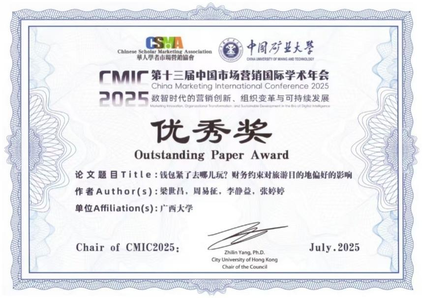 7月4日至7日,第十三届中国市场营销国际学术年会(CMIC2025)在中国矿业大学召开。由公司梁世昌副教授指导,2023级硕士研究生周易征、2022级硕士研究生李静益和张婷婷合作完成的论文《钱包紧了去哪儿玩?财务约束对旅游目的地偏好的影响》荣获“优秀奖”。