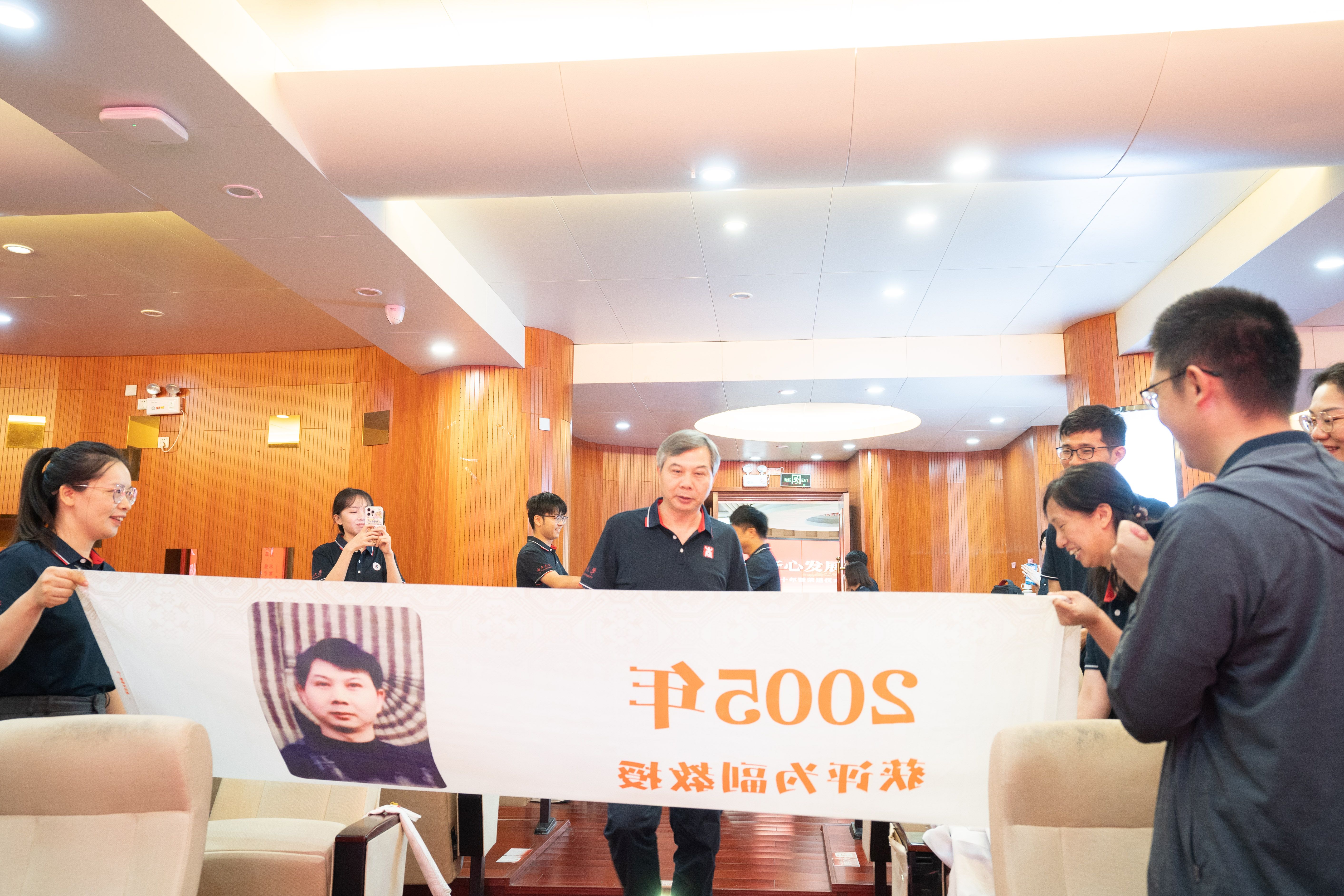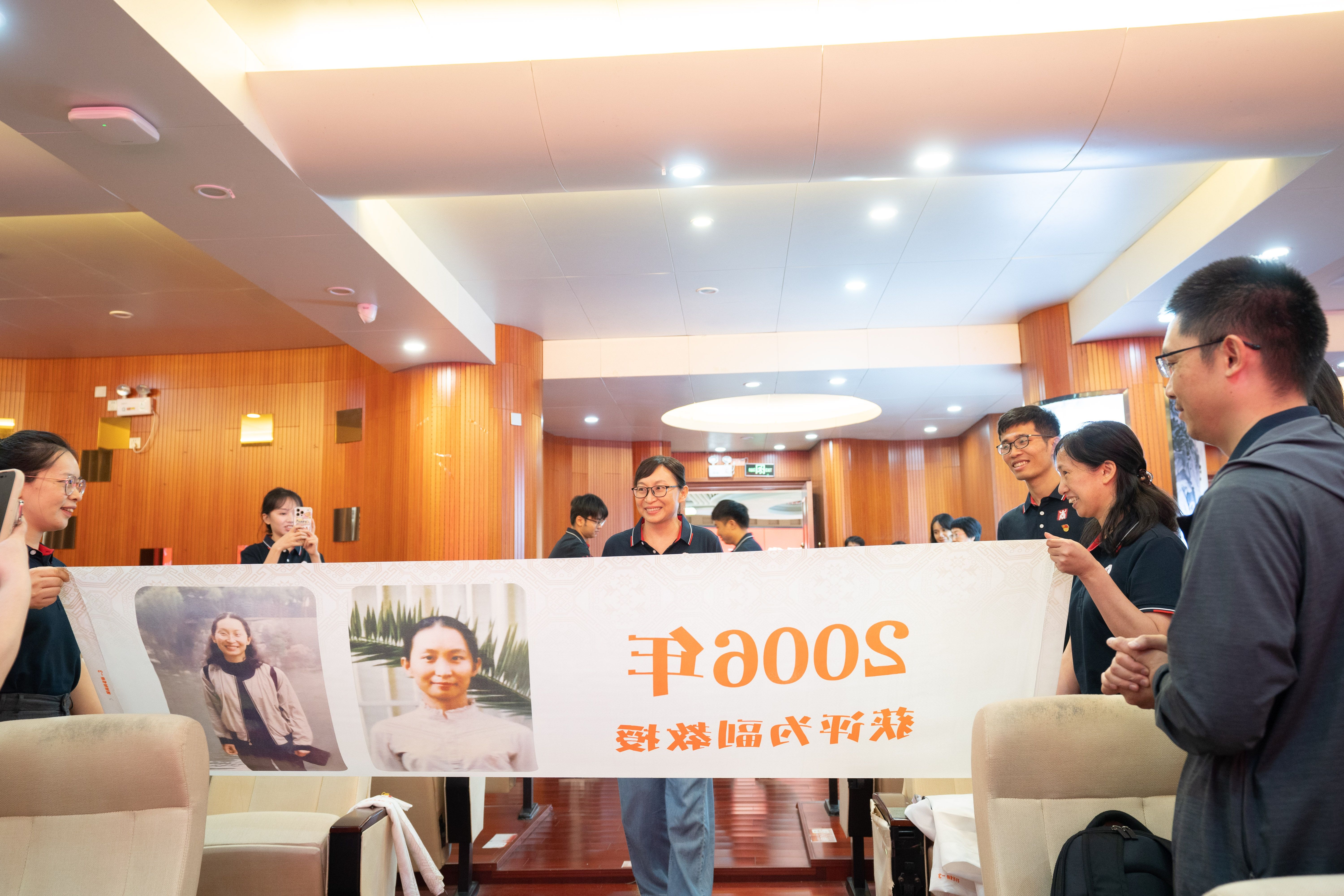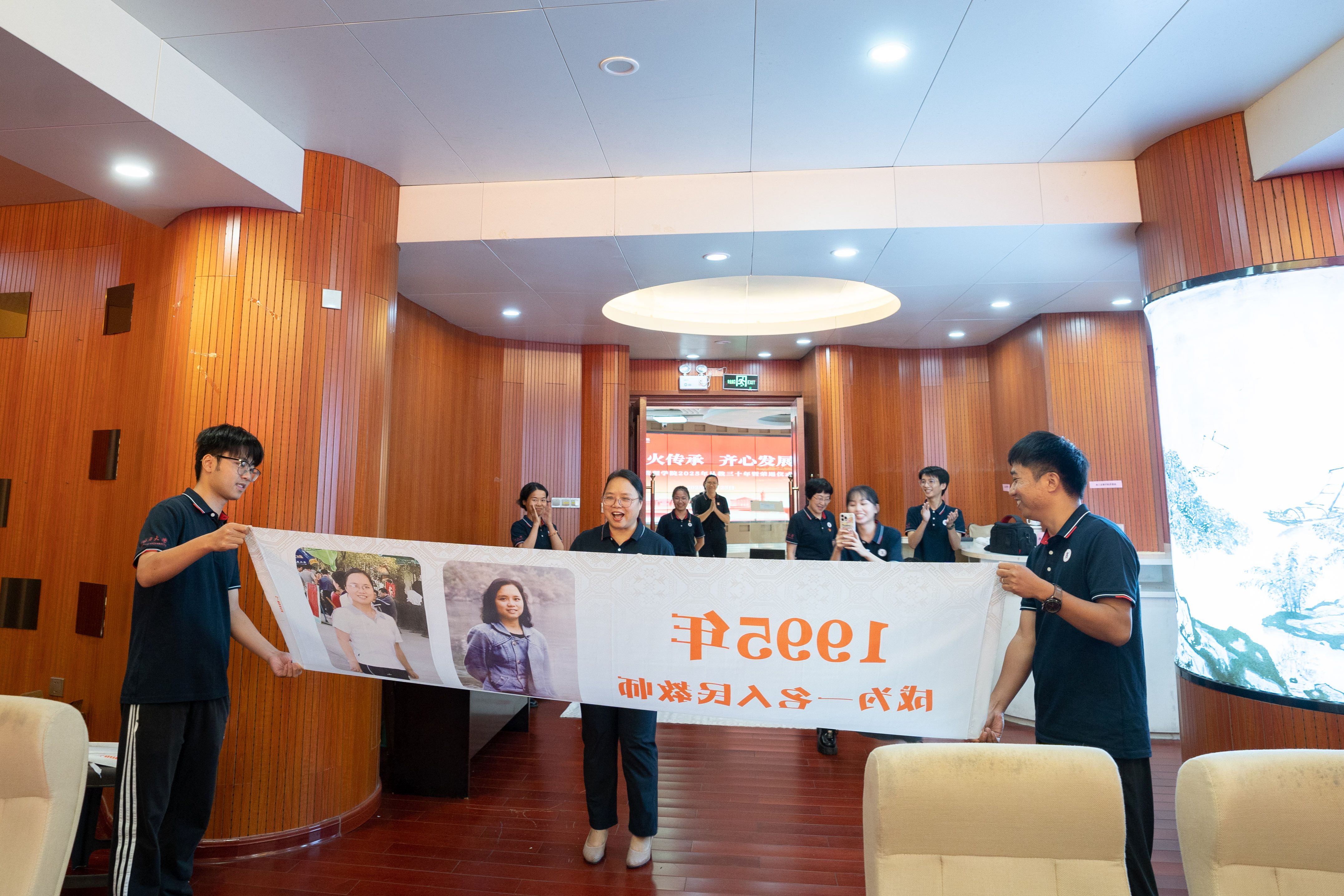 当朱少英、韦铁、滕莉莉、张星文四位从教三十年的老师和2025年荣退的潘思谕老师依次步入报告厅,现场迎来首个温情高潮。公司精心设计的五组纪念横幅沿通道徐徐展开,每幅横幅以时间轴形式呈现他们职业生涯的关键节点:从初登讲台的青涩岁月,到获评职称的重要时刻;从一名普通教师的平凡瞬间,到独当一面的专业负责人……这些珍贵的画面在横幅上一一展现,勾勒出最动人的“奉献长卷”,让在场的每一个人都能深刻感受到他们从教多年的坚守与付出。五位老师看着横幅上的自己,眼中闪烁着泪光,那是回忆的光芒,也是对教育事业深厚情感的流露。