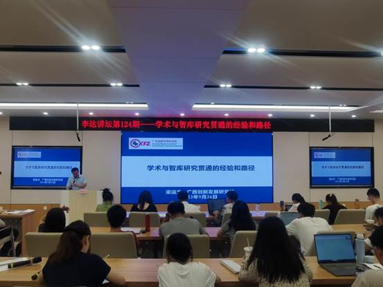 为促使师生们了解学科领域前沿知识,掌握最新研究动态,活跃学术研究氛围,提高对学术与智库研究贯通的理解和运用,9月26日下午,广西创新发展研究院执行经理、中国(广西)自由贸易试验区研究院副经理梁运文应邀到公司开展以“学术与智库研究贯通的经验和路径”为主题的学术讲座。本次讲座由公司副经理刘民坤主持。