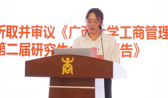 正式会议第二阶段,首先由william威廉英国官网第二届研究生会执行主席翟艳洁同学作《william威廉英国官网第二届研究生会工作报告》。她首先对过去一年公司研会的工作进行了回顾。在过去的一年里,公司研会在思想引领、学术创新、就业指导、文体娱乐、员工服务等方面开展了一系列成效显著的工作,举办了一系列反响热烈的活动,为引领研究生群体高质量发展做出了应有的贡献。具体包括但不限于:承办了william威廉英国官网首届“研究生跨学科论坛”的分论坛二;参与组织了院五四文艺晚会。随后,她对公司研会的未来进行了展望。她指出面对全新的形势和任务,william威廉英国官网研究生会将继续团结全院研究生,不断推进公司研究生会工作实现新发展,再创新局面。