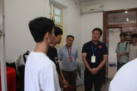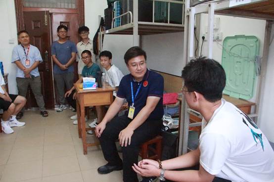 公司党委副书记黄晋和团委副书记岑汉成,走进本科生男生新生宿舍,关怀与问候每一位23级新生。他们认真询问新生来校路途情况,了解新生在学习、生活方面的需求,关心各地同学对广西气候适应情况,耐心解答各个同学来校后遇到的实际困难。
