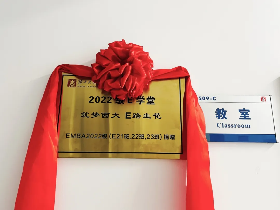 毕业欢送会开始之前,朱少英副经理,EMBA21班班长龙毅、22班班长徐文汇、23班班长范伟民共同为2022级EMBA同学冠名捐赠的509C教室揭牌,欢送会现场的老师和同学们通过直播形式,观看、见证了揭牌仪式。“2022级E学堂——筑梦西大,E路生花”,不仅承载着22级EMBA同学们对未来的美好憧憬和祝福,更展现了同学们对母校的感恩和关怀。