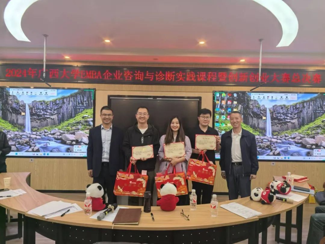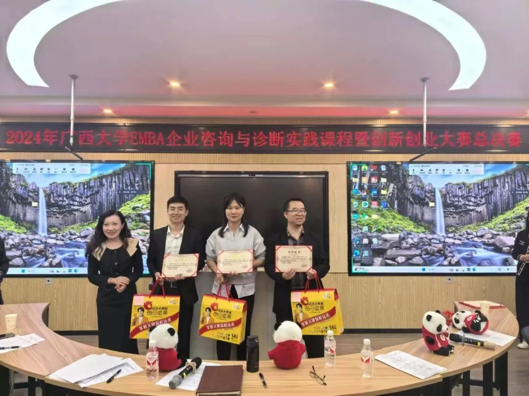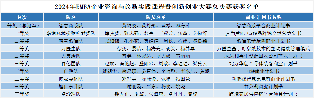 在紧张的算分环节后,胡峰副教授公布了2024年EMBA企业咨询与诊断实践课程暨创新创业大赛总决赛的获奖名单,评委们为获奖队伍颁发奖状和奖品。