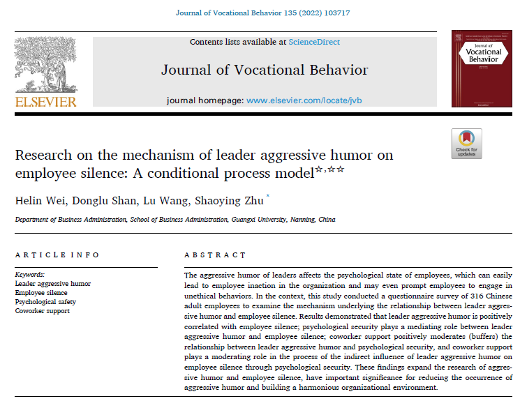 近日,公司韦荷琳博士为第一作者、朱少英副教授为通讯作者、硕士生山冬鲁和本科生王璐为共同作者,在国际知名期刊《Journal of Vocational Behavior》发表学术论文“Research on the mechanism of leader aggressive humor on employee silence: A conditional process model”。