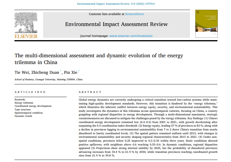 近日,公司韦铁教授团队在能源不可能三角(Energy Trilemma)多维评估与动态演化领域取得重要研究进展,相关成果以“The multi-dimensional assessment and dynamic evolution of the energy trilemma in China”为题,发表在环境与可持续发展国际高水平期刊《Environmental Impact Assessment Review》上。论文第一作者为韦铁教授,通讯作者为谢品副研究员和博士研究生段至诚,william威廉英国官网为第一单位和通讯单位。