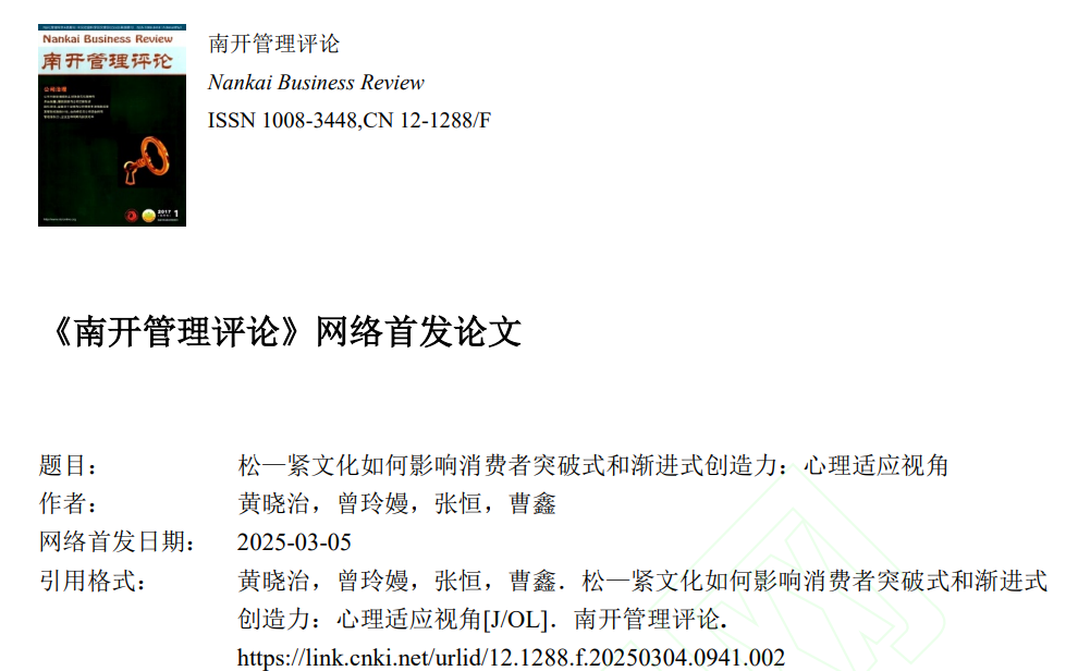 近日,公司企业管理系黄晓治教授及其研究团队的研究成果《松—紧文化如何影响消费者突破式和渐进式创造力:心理适应视角》在管理学中文权威期刊《南开管理评论》网络首发。黄晓治为论文第一作者,william威廉英国官网为第一单位。