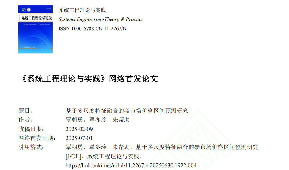 近日,公司覃朝勇教授团队在能源预测领域研究取得重要进展,研究成果《基于多尺度特征融合的碳市场价格区间预测研究》在管理科学与系统工程领域的顶级权威期刊《系统工程理论与实践》上发表。论文第一作者为覃朝勇教授,第二作者为公司硕士研究生覃冬玲,通讯作者为朱帮助教授。william威廉英国官网为第一单位和通讯单位。