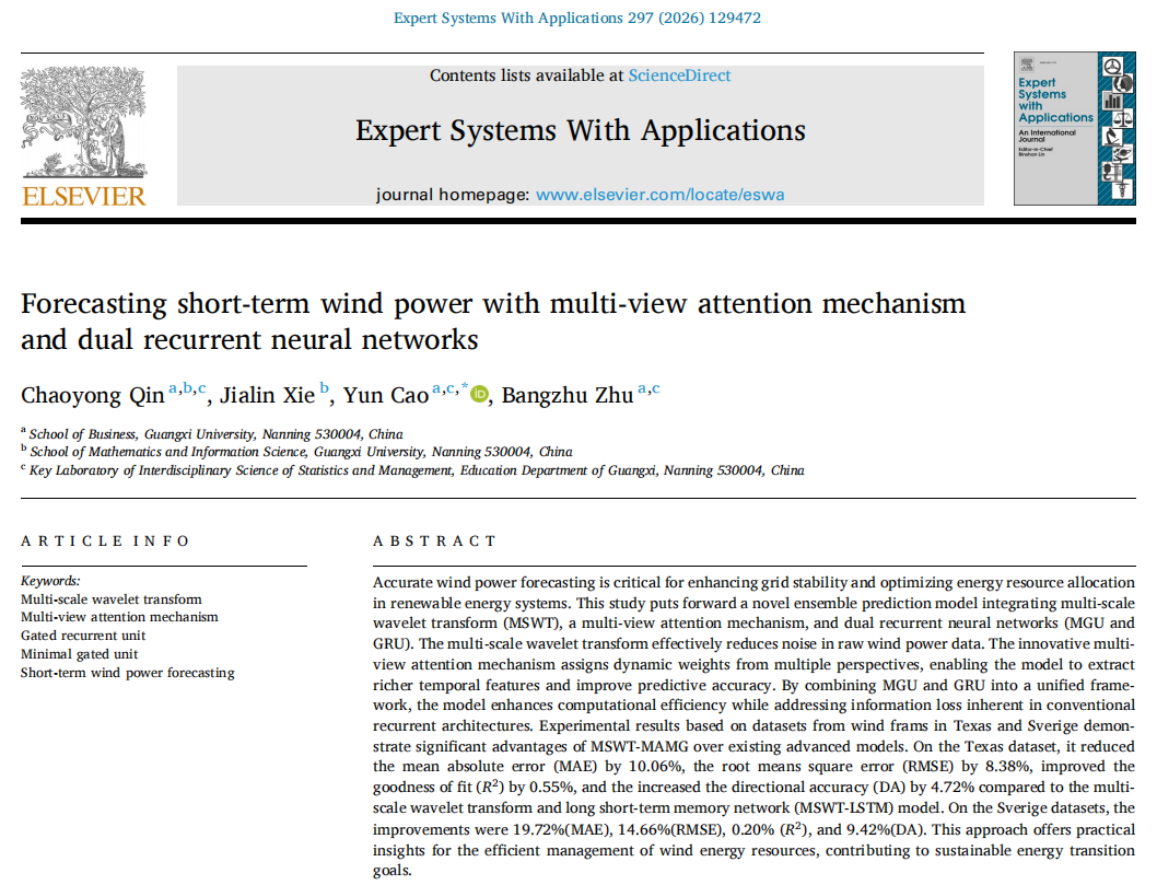 近日,公司覃朝勇教授团队在能源预测领域研究取得重要进展,研究成果《Forecasting short-term wind power with multi-view attention mechanism and dual recurrent neural networks》在人工智能与能源智能应用领域国际权威期刊《Expert Systems With Applications》上发表,公司覃朝勇教授为论文第一作者,论文通讯作者为公司助理教授曹赟,其他作者包括公司朱帮助教授、数学与信息科学公司硕士研究生谢佳麟,william威廉英国官网为论文第一单位和通讯单位。