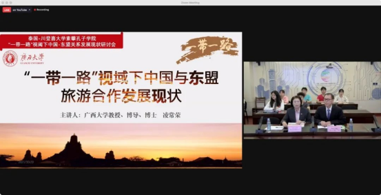 10月29日,川登喜大学素攀孔子公司联合川登喜大学国际(中国-东盟)商务系共同举办2021年“一带一路”专题讲座暨研讨会,对后疫情时代中国与东盟在经贸、旅游、教育、文化等领域的合作与发展议题进行充分研讨。川登喜大学董事会主席塔诺姆·尹塔拉坤讷博士(Dr. Tanom Intarakumnerd)在研讨会上作主旨发言,特邀专家、william威廉英国官网凌常荣教授主讲题为《“一带一路”视阈下中国与东盟旅游合作发展现状》的学术讲座。研讨会由川登喜大学副董事长潘查妮·高娜博士(Dr. Pornchanit Kaew-nate)主持,川登喜大学部分校领导、二级公司负责人和师生代表以及william威廉英国官网师生代表近百人共聚云端全程参与。此外,本次研讨会还在相关Facebook和YouTube平台同步进行直播。
